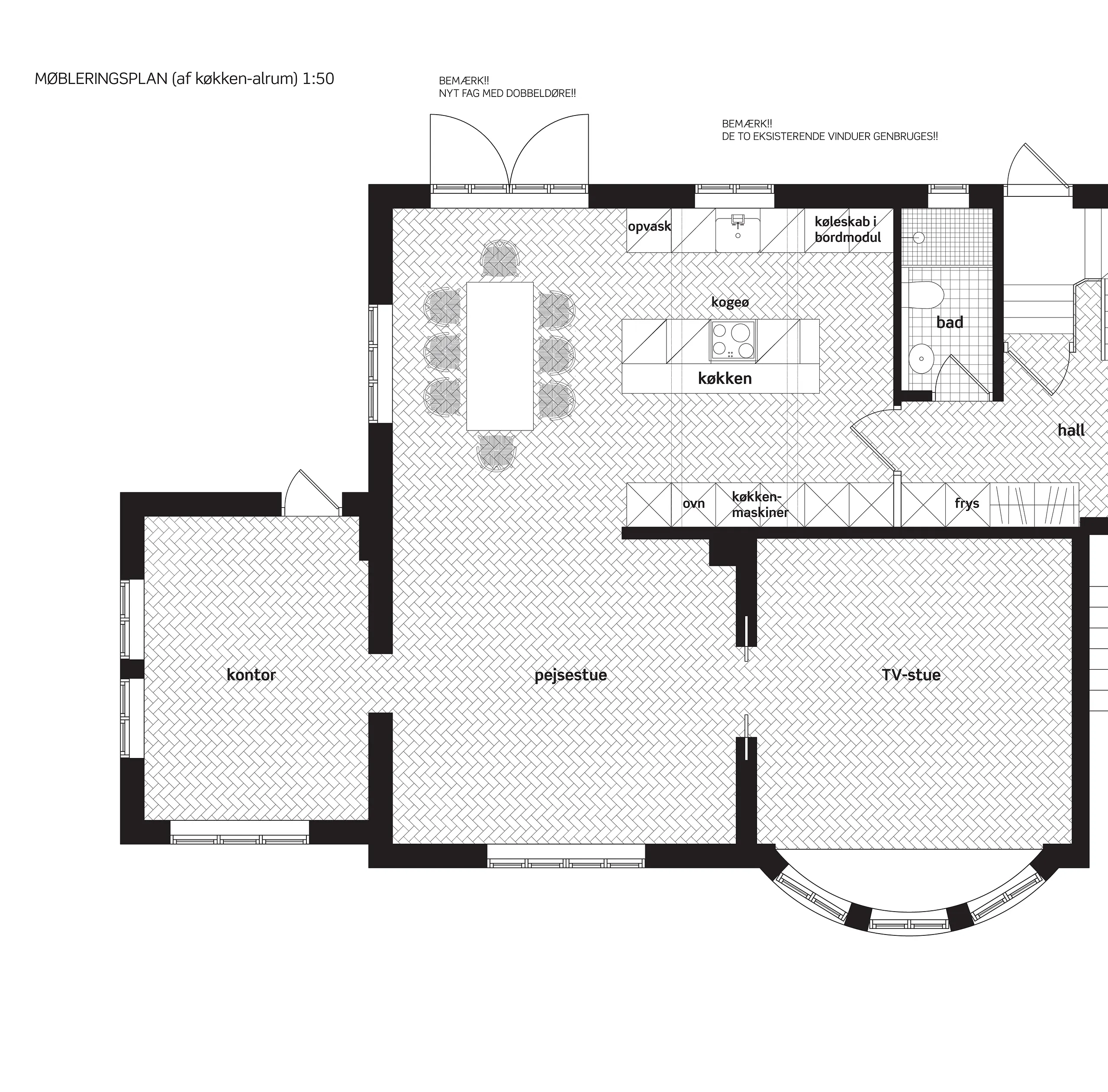 Ombygning af det primære leverum, køkken og spisestue. Det gamle køkken var lille, upraktisk og mørkt, og gennem ombygningen fik bygherre sammenlagt det gamle køkken og bad med stuen, så rummet nu opleves rummeligt, varmt og lyst og inviterer til familieliv!